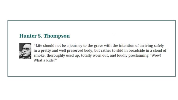 One of my favorite quotes is by Hunter S. Thompson. Basically saying live life to the fullest. More and more, it echoes my feelings about this life. So many of the messages we receive along the way are around moderation. The safe way. "Save money for retirement". "Eat healthy food". "Don't drink too much". You... Continue Reading →